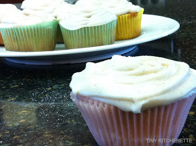Fill cupcake liners. Stick in oven and bake at 350 for 18-20 minutes. Frost with cream cream frosting.